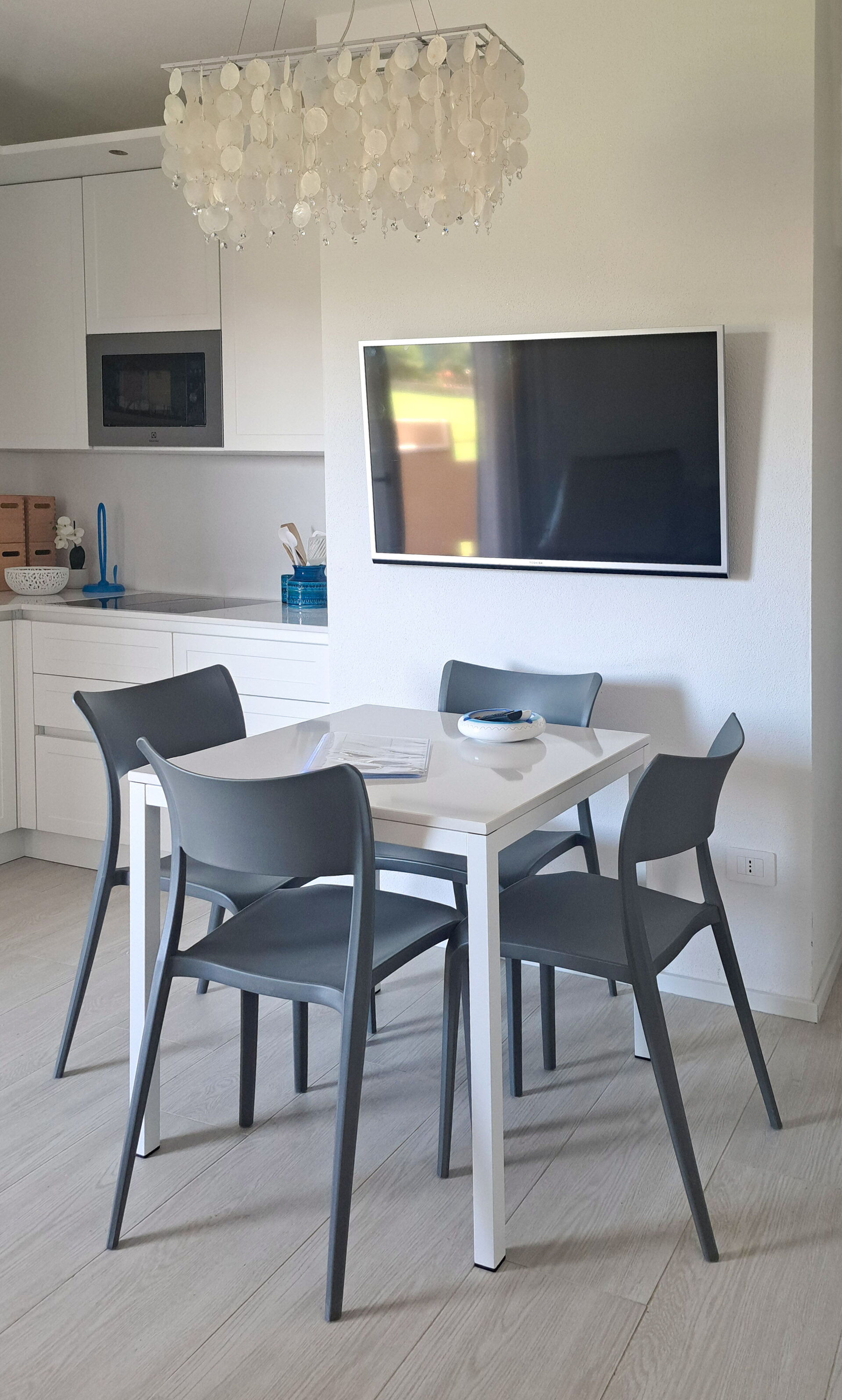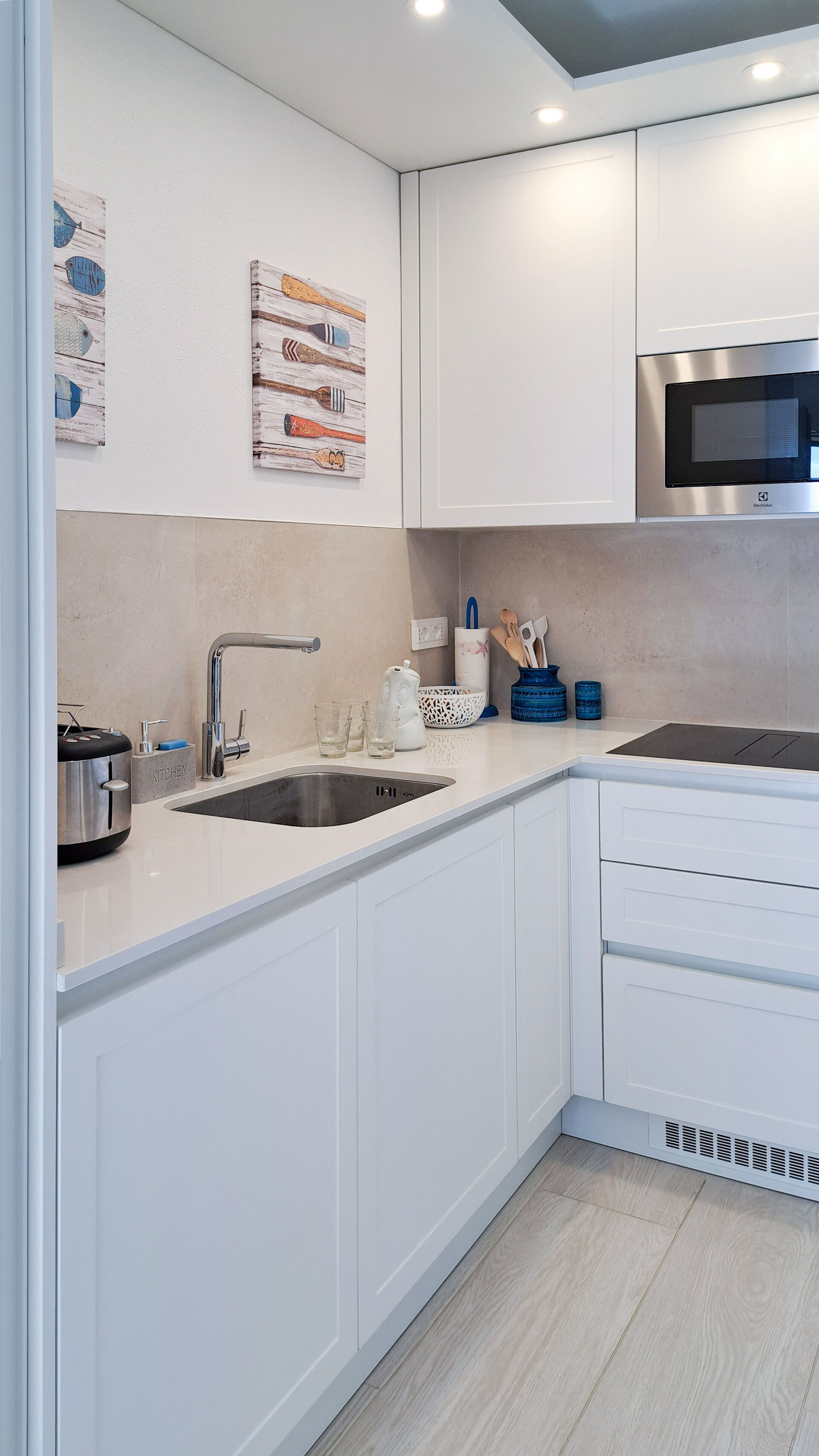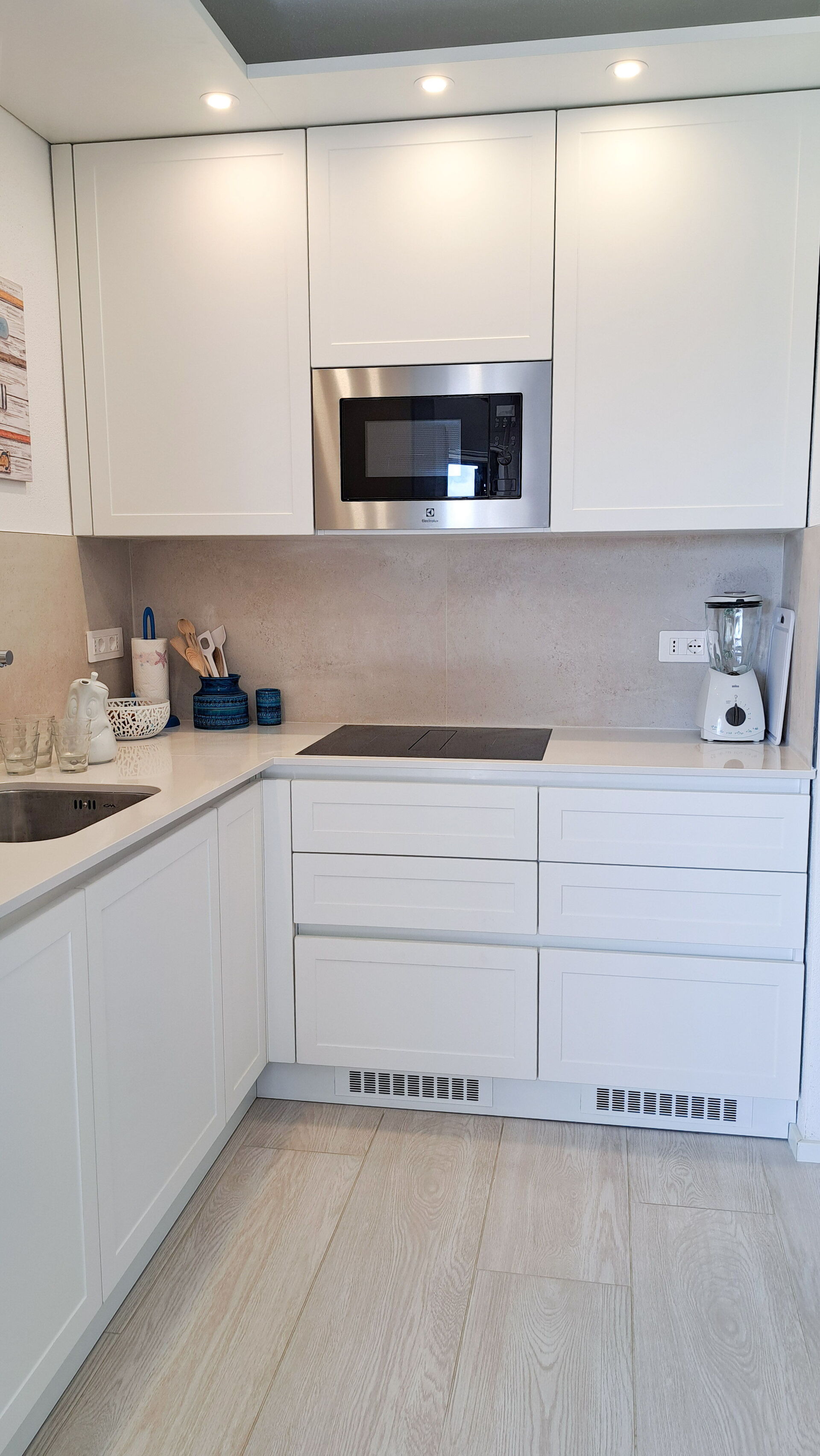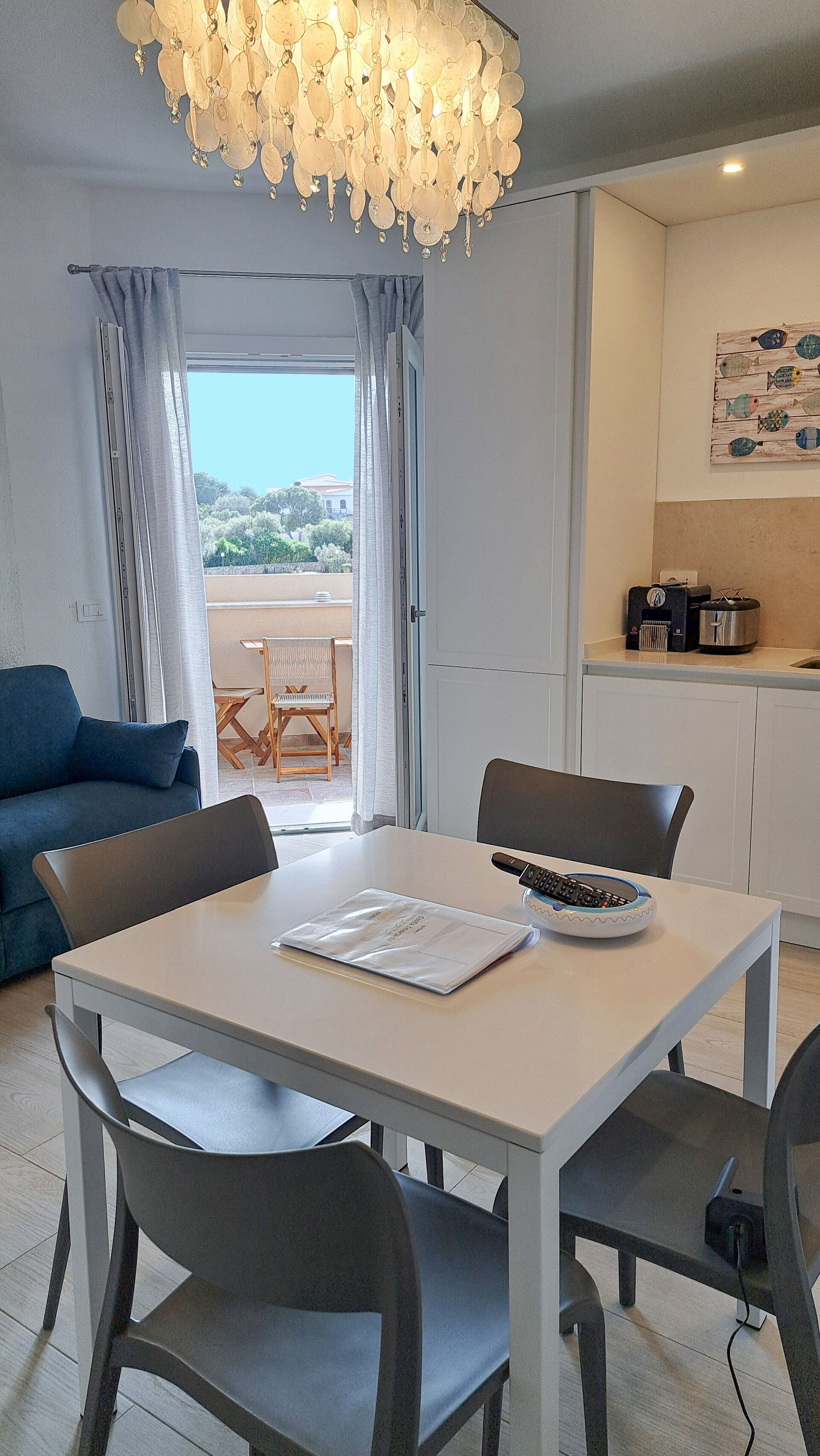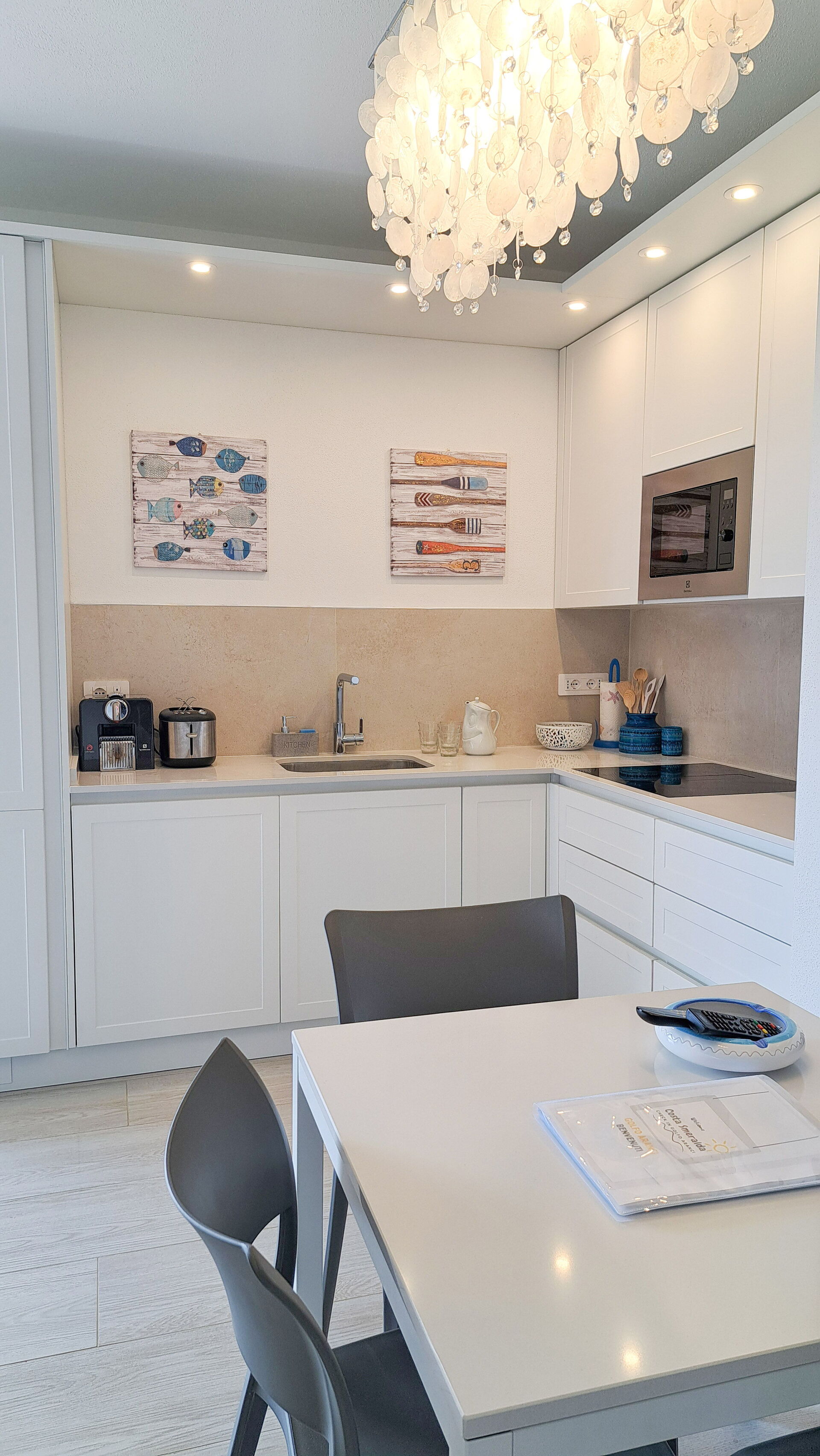 Køkkenet er udstyret med opvaskemaskine, induktionskogeplade, kombineret ovn/mikrobølgeovn, køleskab med fryser, italiensk mokka-kande, kaffemaskine og Nespresso-maskine.