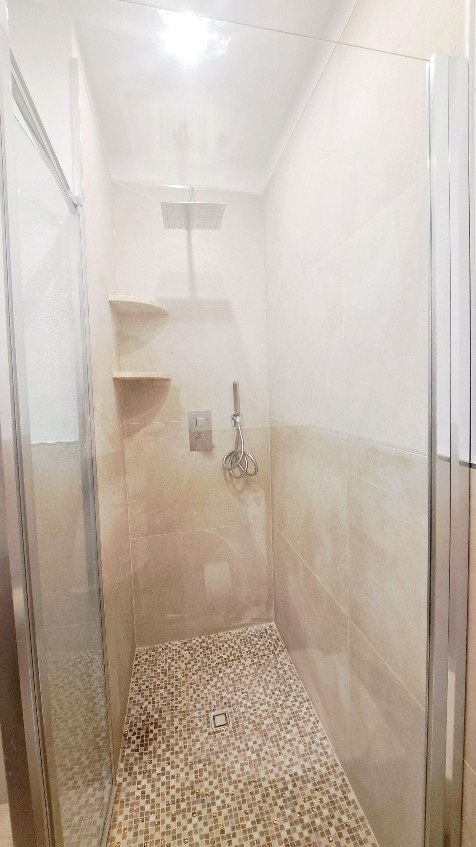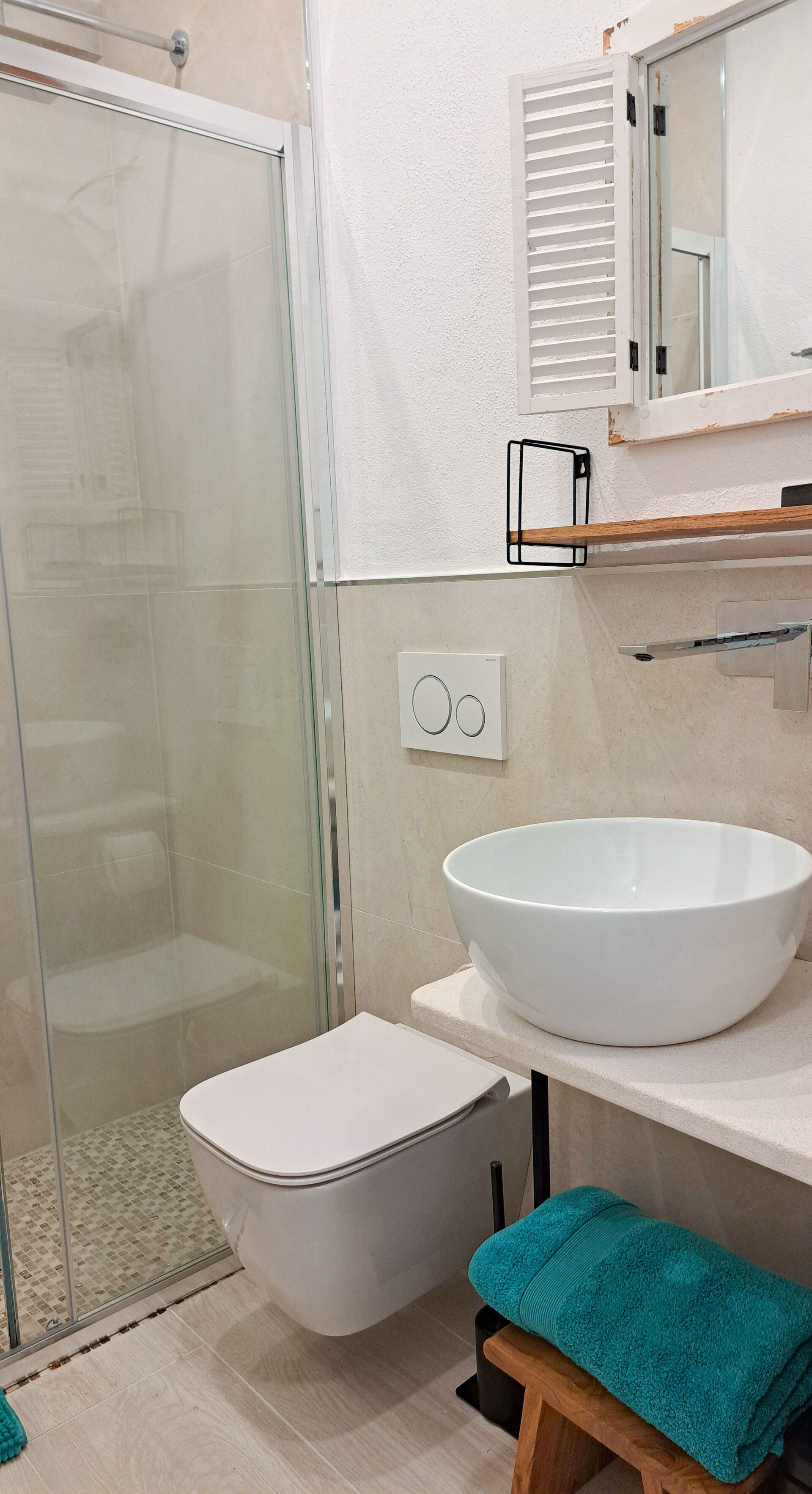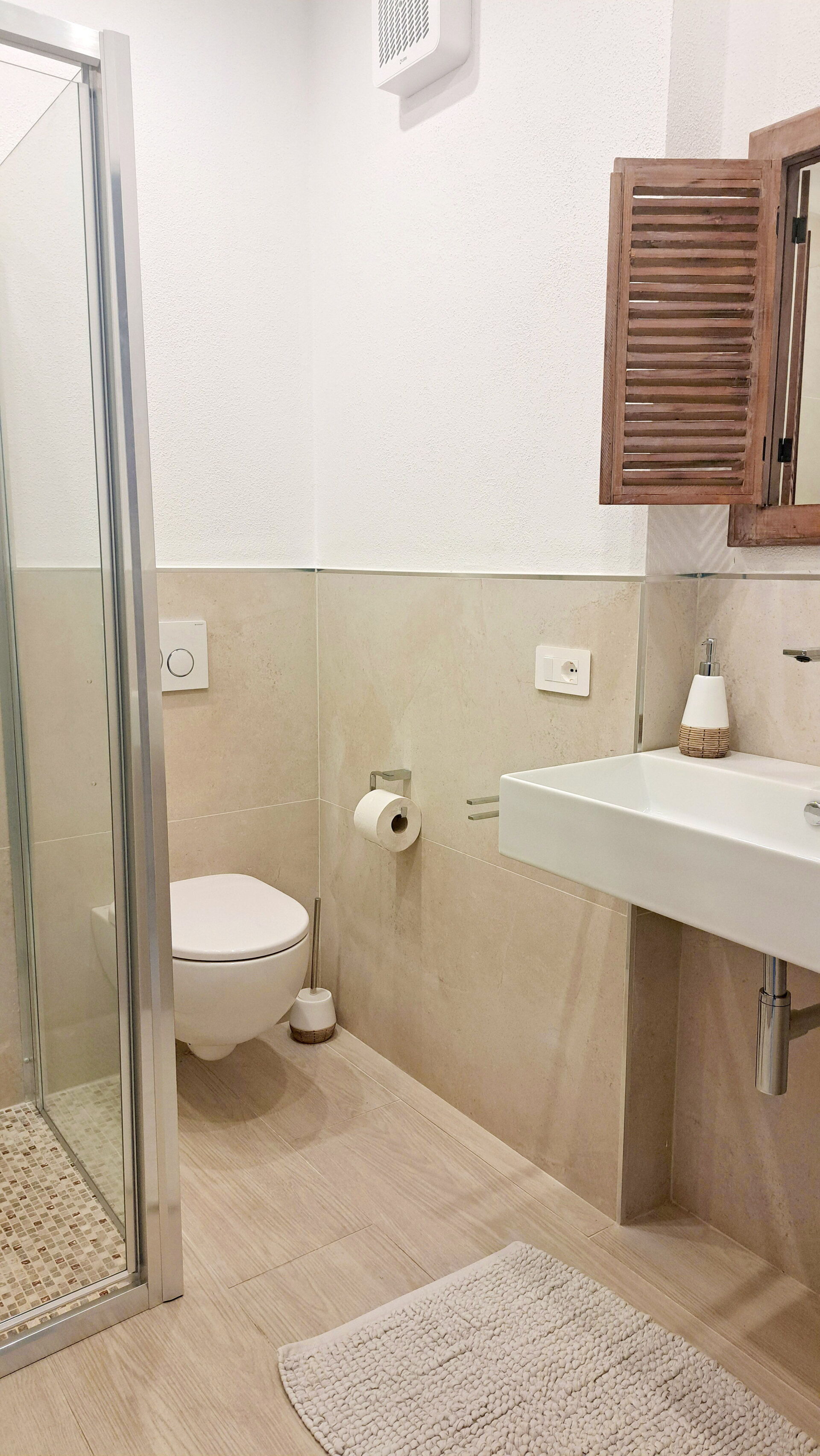 To badeværelser, begge udstyret med hårtørrer, bruser, håndvask, toilet (ingen bidet).