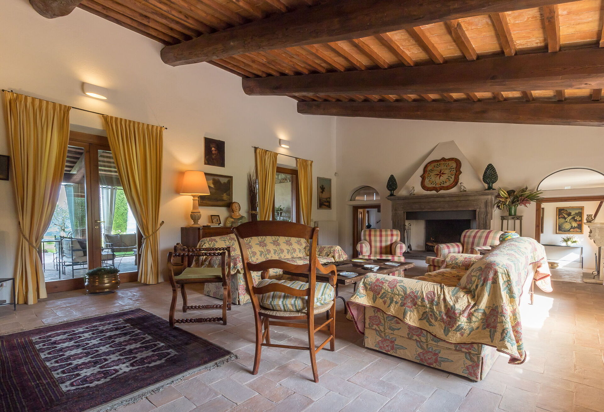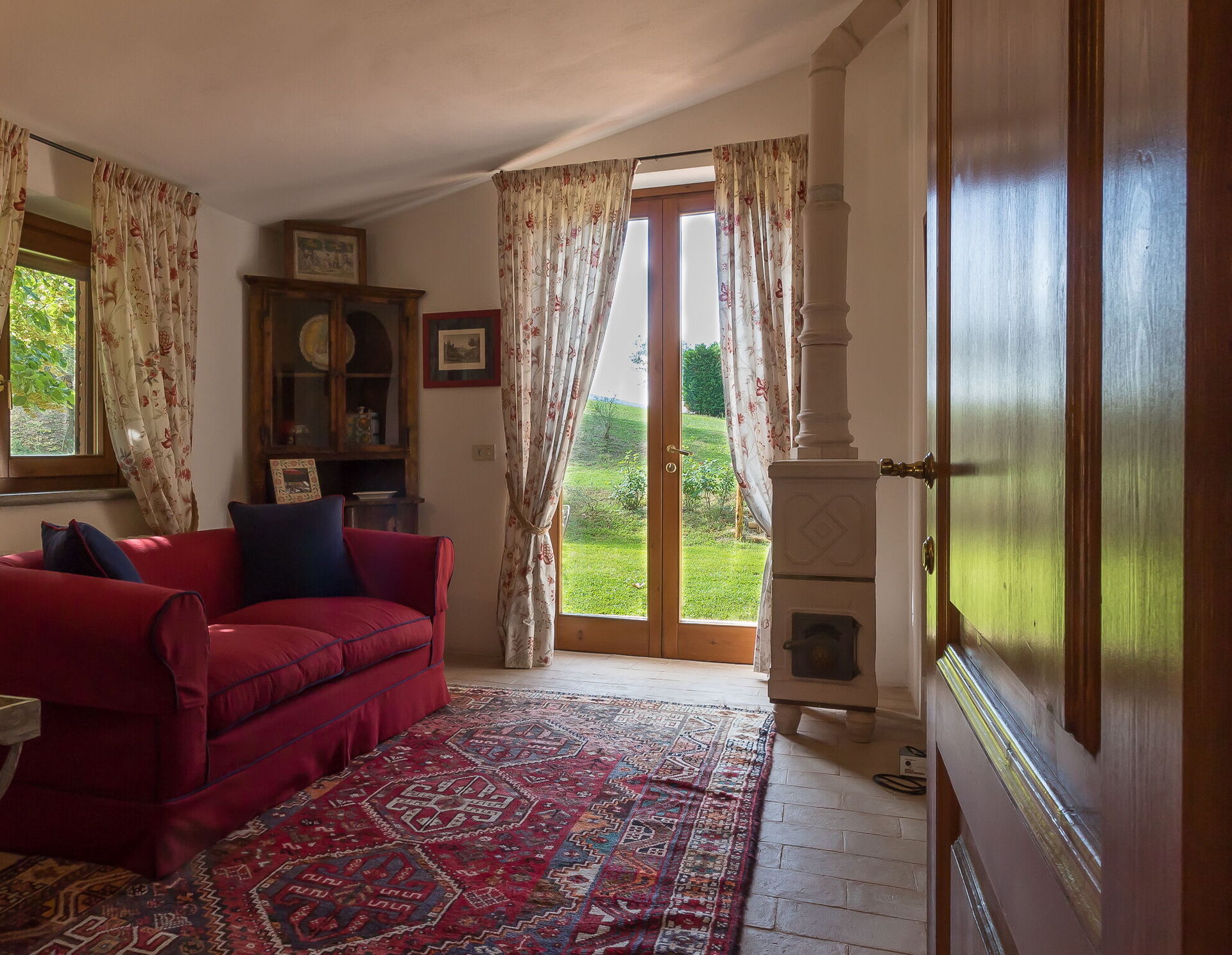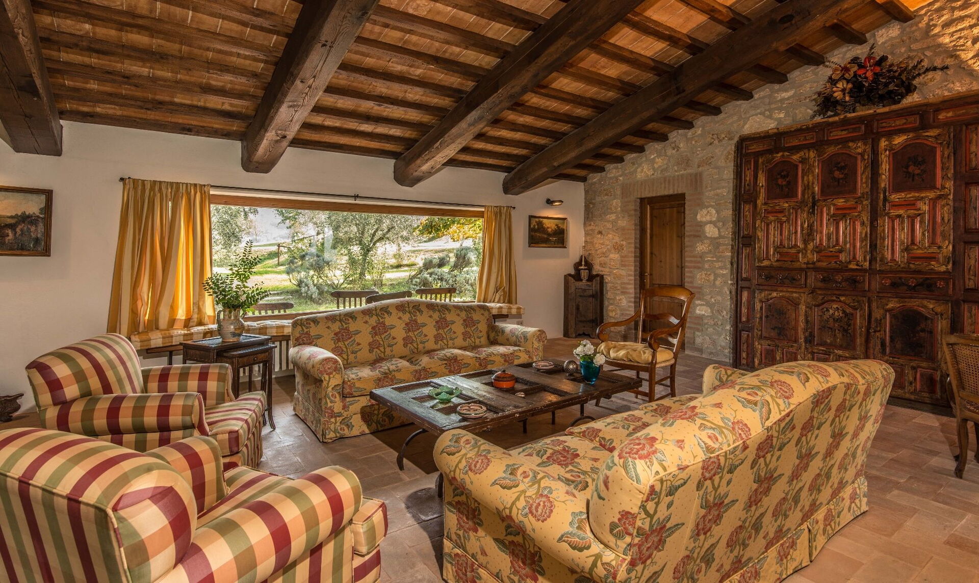 Summer living room with comfortable sofas and armchairs. Stunning view over the countryside!