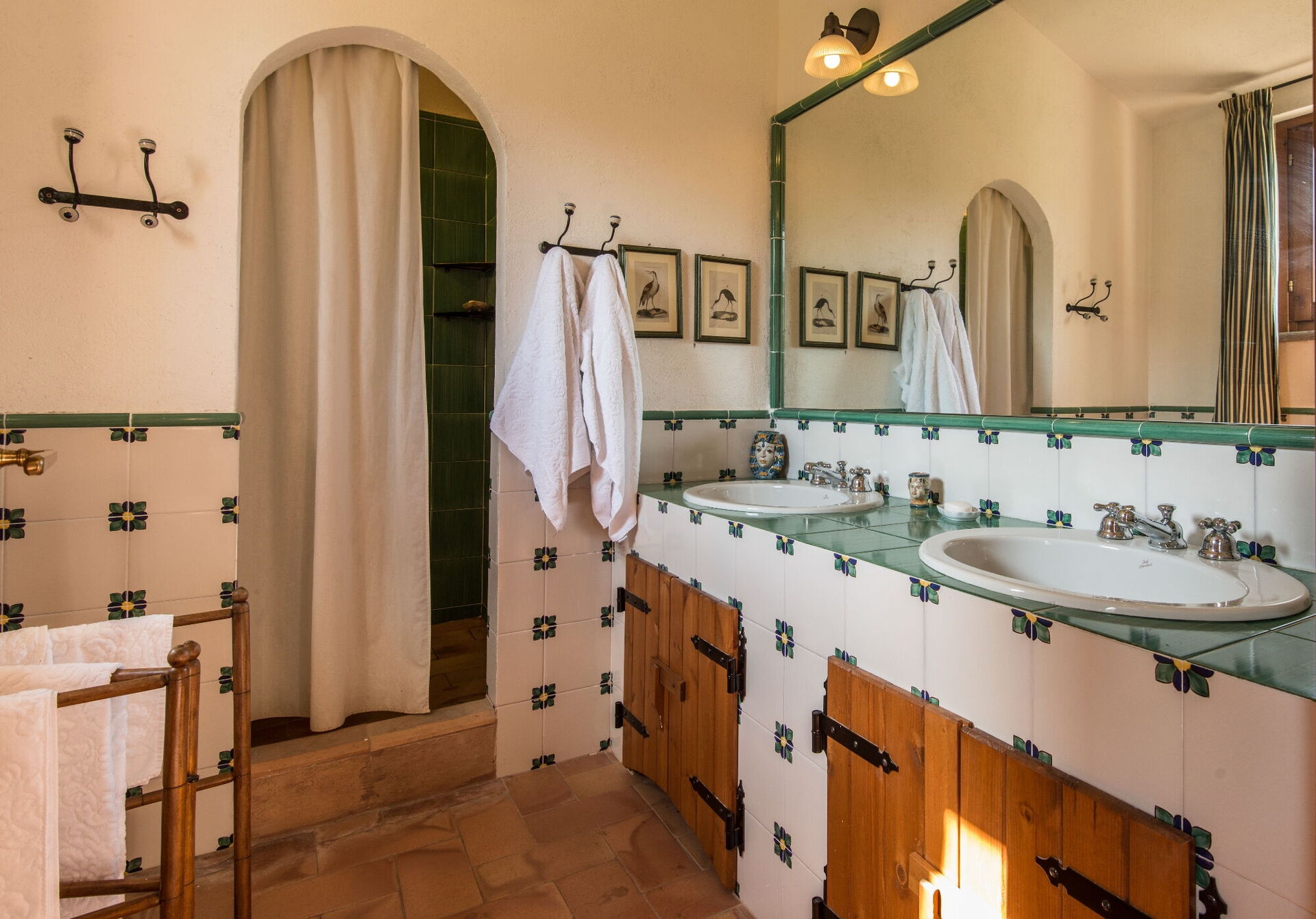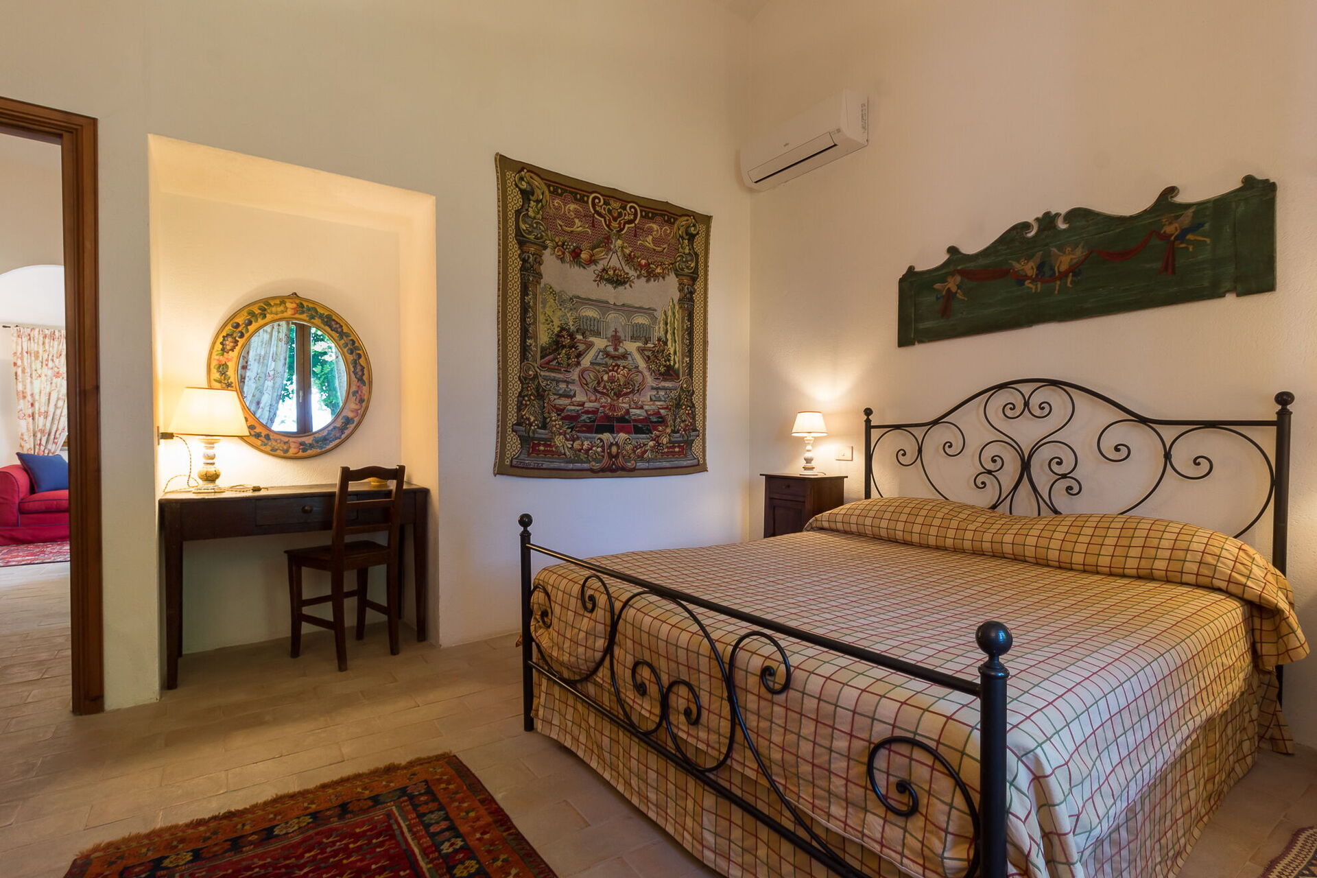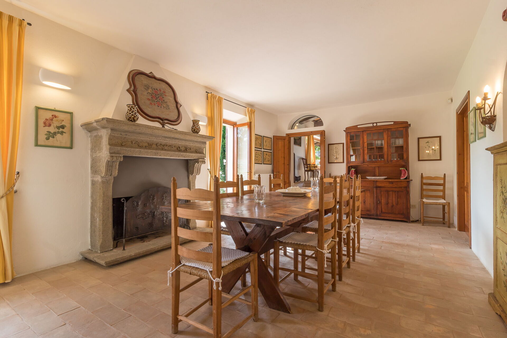 Du vil finde denne ekspansive feriebolig gennemtænkt designet til at rumme op til 14 gæster fordelt på 7 soveværelser og 7 badeværelser, fordelt mellem hovedhuset og en anneks. Hovedhuset har en stueetageindgang, der byder dig velkommen til en første stue møbleret med en behagelig Chesterfield-sofa og et par lænestole, der tilbyder siddepladser til op til 7 personer. Ved siden af dette rum vil du opdage en stor stue med en funktionsdygtig pejs og behagelige sofaer og lænestole, der kan rumme op til 10 eller 12 personer, med dobbeltdøre, der åbner ud til den overdækkede loggia, hvor du kan slappe af og nyde udsigten. Ved siden af stuen er der en stor spisestue med funktionsdygtig pejs, der rummer op til 14 personer. Stueetagen inkluderer også et stort køkken med separat spiseplads, funktionsdygtig pejs og et bord til 8 personer, med dobbeltdøre, der åbner ud til en spiseterrasse og en anden udendørs stue. Et gæstebadeværelse betjener denne etage. Stueetagen afsluttes med et airconditioneret dobbeltværelse med king size seng, separat opholdsstue og walk-in garderobe, ledsaget af et ensuite badeværelse med badekar med håndholdt bruser og separat brusekabine. Første sal har sengepladser til op til 8 personer og byder på dejlig udsigt over de bølgende bakker og landskabet. Du vil finde et master bedroom med king size seng, funktionsdygtig pejs og walk-in garderobe med et ensuite badeværelse med bruser og dobbelt vask. Tre yderligere soveværelser på denne etage tilbyder fleksible sovearrangementer med enkeltsenge, der kan sættes sammen til dobbeltsenge. Et af disse soveværelser inkluderer en walk-in garderobe, og deres ensuite badeværelser har enten brusere eller badekar med håndholdt bruser. Annekset, tilgængeligt mod ekstra betaling, tilbyder 2 yderligere airconditionerede soveværelser. Et enkelt- eller dobbeltværelse med enkeltsenge, der kan sættes sammen, har dobbeltdøre, der fører ud til haven, og et ensuite badeværelse med bruser. Et dobbeltværelse med queen size seng har en dør, der fører ud til haven, og et ensuite badeværelse med bruser.