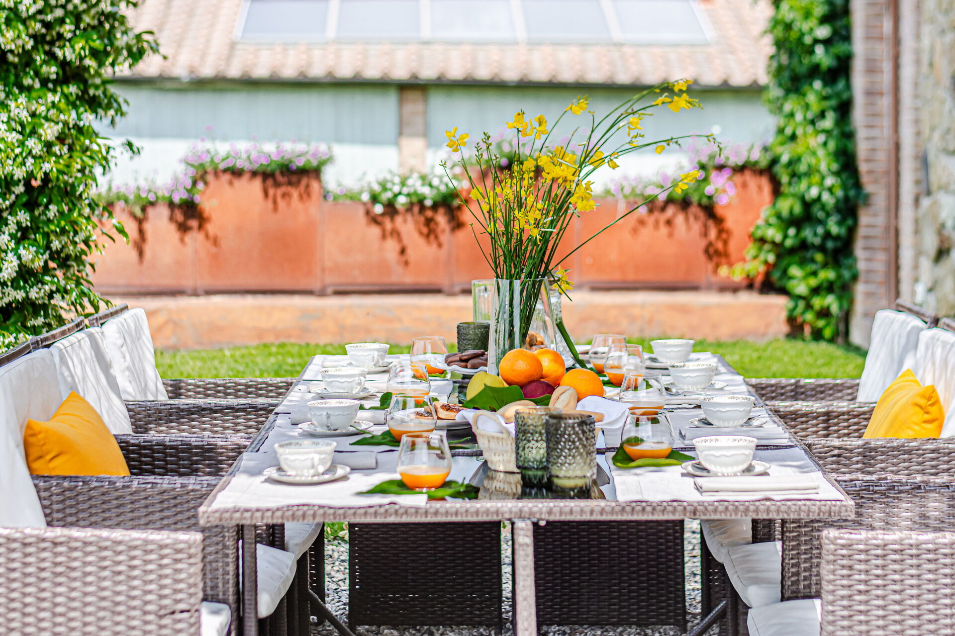 Ejendommens udendørsarealer strækker sig over det storslåede gods og giver dig mulighed for at fordybe dig i den naturlige skønhed i det toskanske landskab. Du kan spadsere gennem de omfattende grunde prydet med vingårde, der i øjeblikket producerer cirka 300 quintals druer årligt, vandre blandt olivenlundene eller udforske skovområderne, der giver skygge og sindsro. Den ekspansive gård tilbyder rigelig plads til udendørsaktiviteter og afslapning, mens det omkringliggende landskab præsenterer betagende udsigter over de bølgende bakker, der karakteriserer denne berømte region.