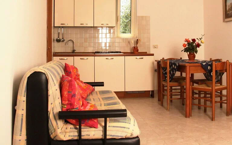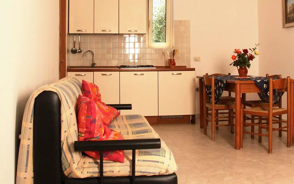 Comfortable holiday village "Passo dell'Arciprete". 2 km from the centre of Vieste, on top of a hill, 1 km from the sea, in the countryside. For shared use: property with plants and trees, swimming pool (18 x 9 m, seasonal availability: 19.May.-16.Sep.). Shower/WC in the pool area, tennis, table tennis, terrace, garden furniture, barbecue, children's playground. In the complex: bar, lounge with TV, WiFi, solarium, air conditioning, washing machine (for shared use). Room cleaning on request (extra). Parking. Grocery, supermarket, restaurant, bar 500 m, sandy beach 1 km. Nearby attractions: Isole Tremiti, Faro di Vieste 3 km, San Giovanni Rotondo 75 km, Lago di Varano 55 km, Peschici 25 km. Please note: car recommended. Guarded residence. The photograph shows a typical example. There are more similar properties for rent in this same residence. The village consists of 33 single and semi-detached houses and offers a beautiful view of the sea and the town of Vieste. The price includes beach service at an affiliated bathing establishment (1 umbrella and 2 sunbeds) located about 1.5 km from the village.