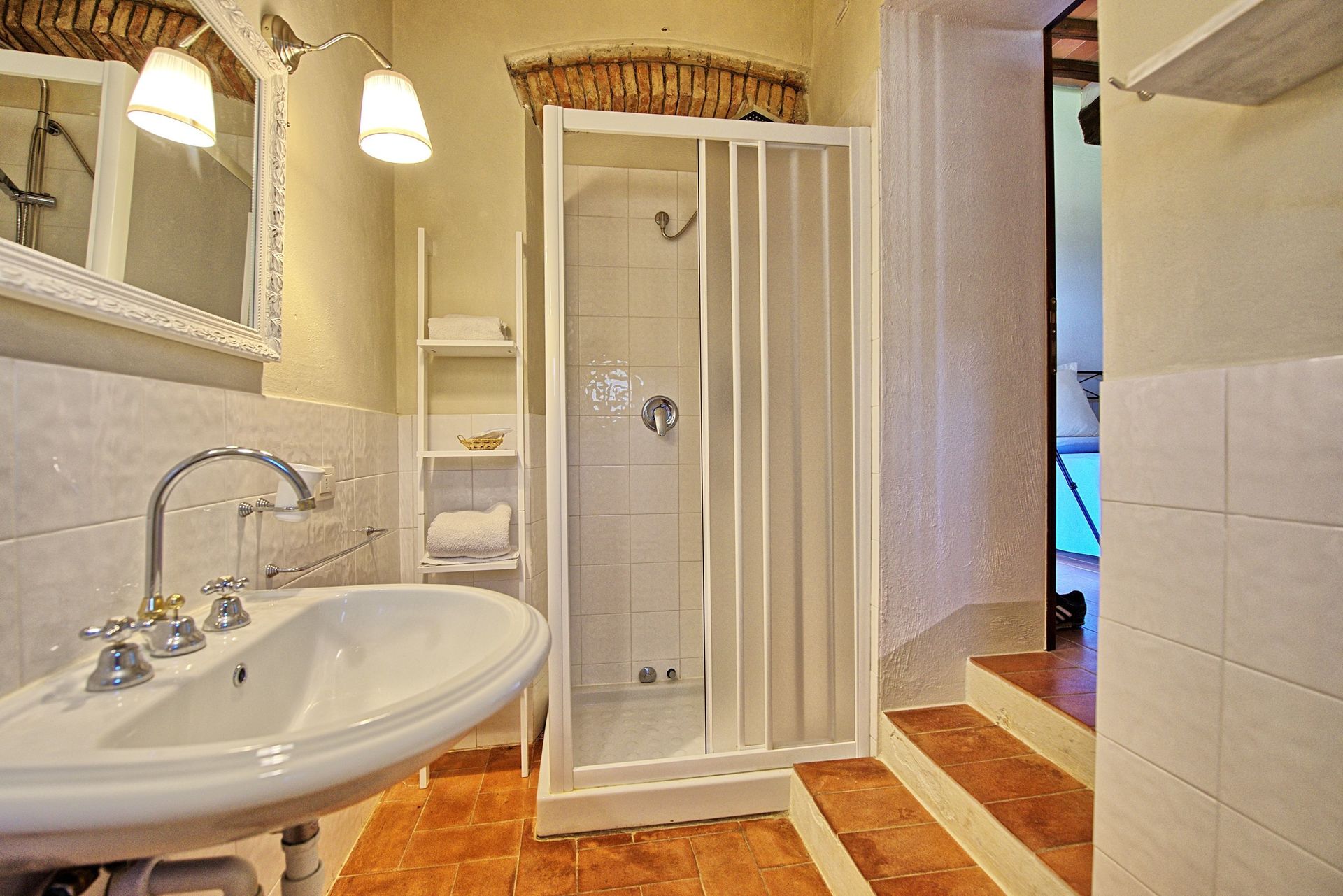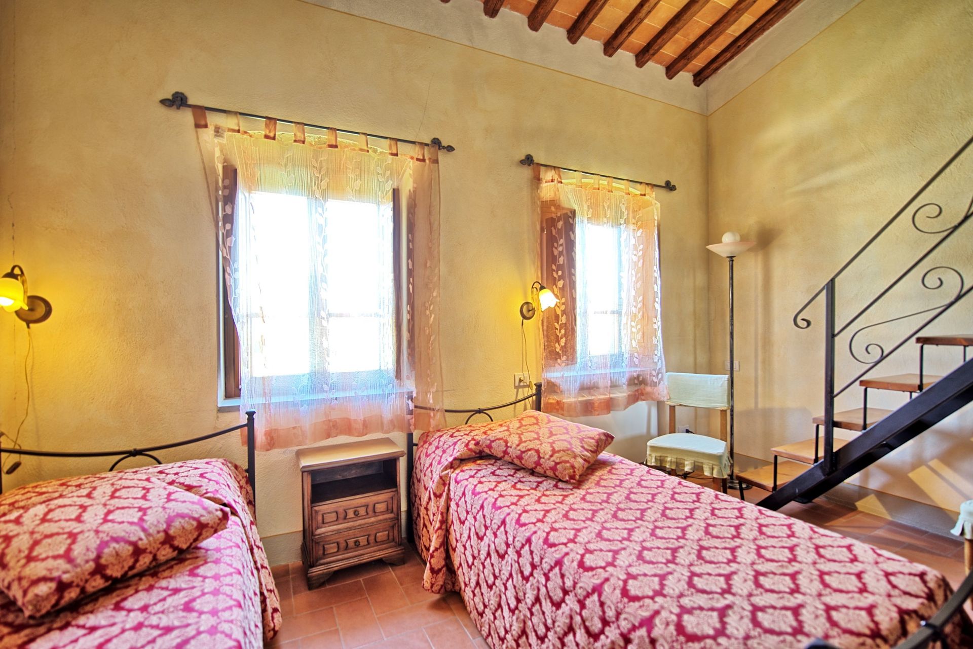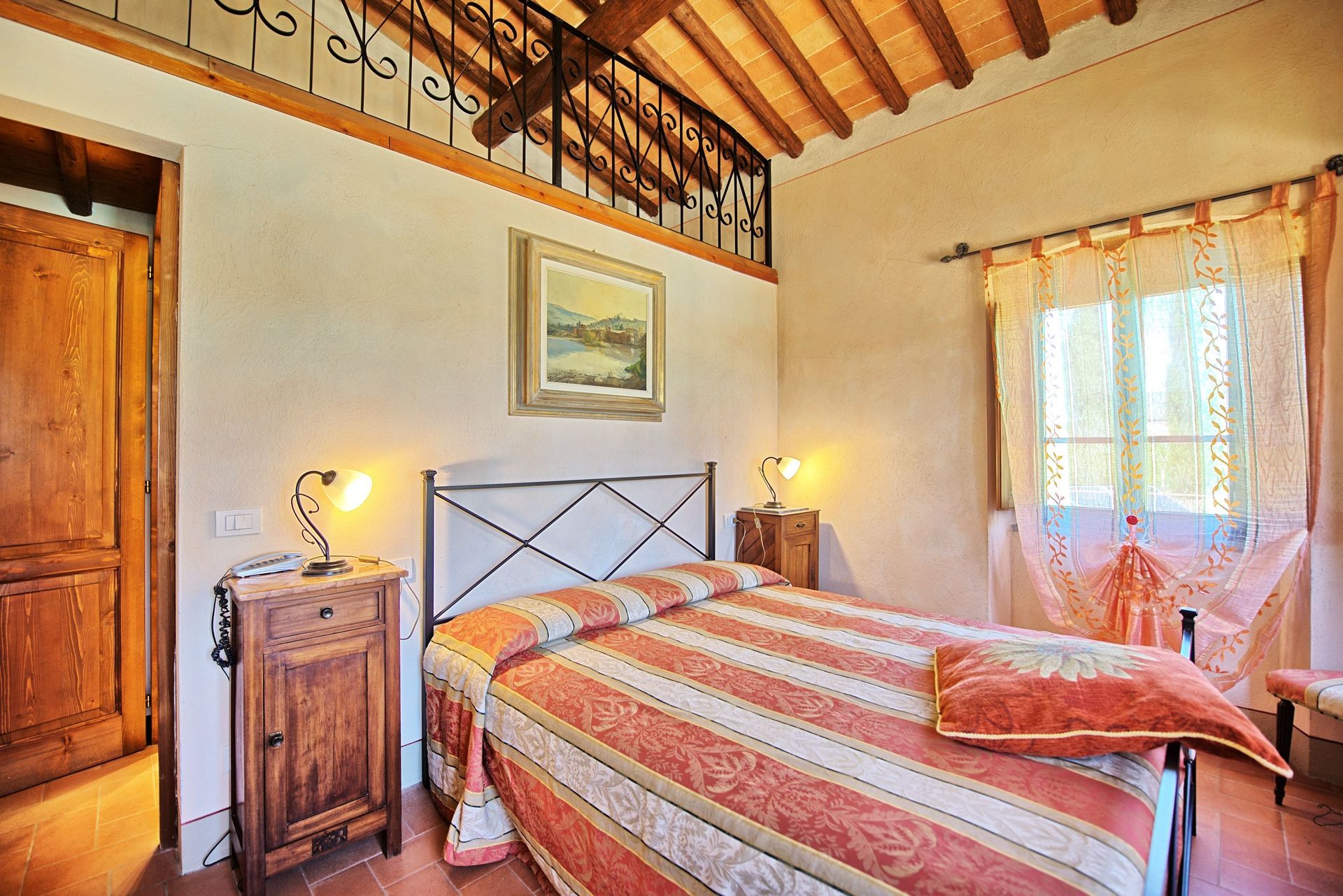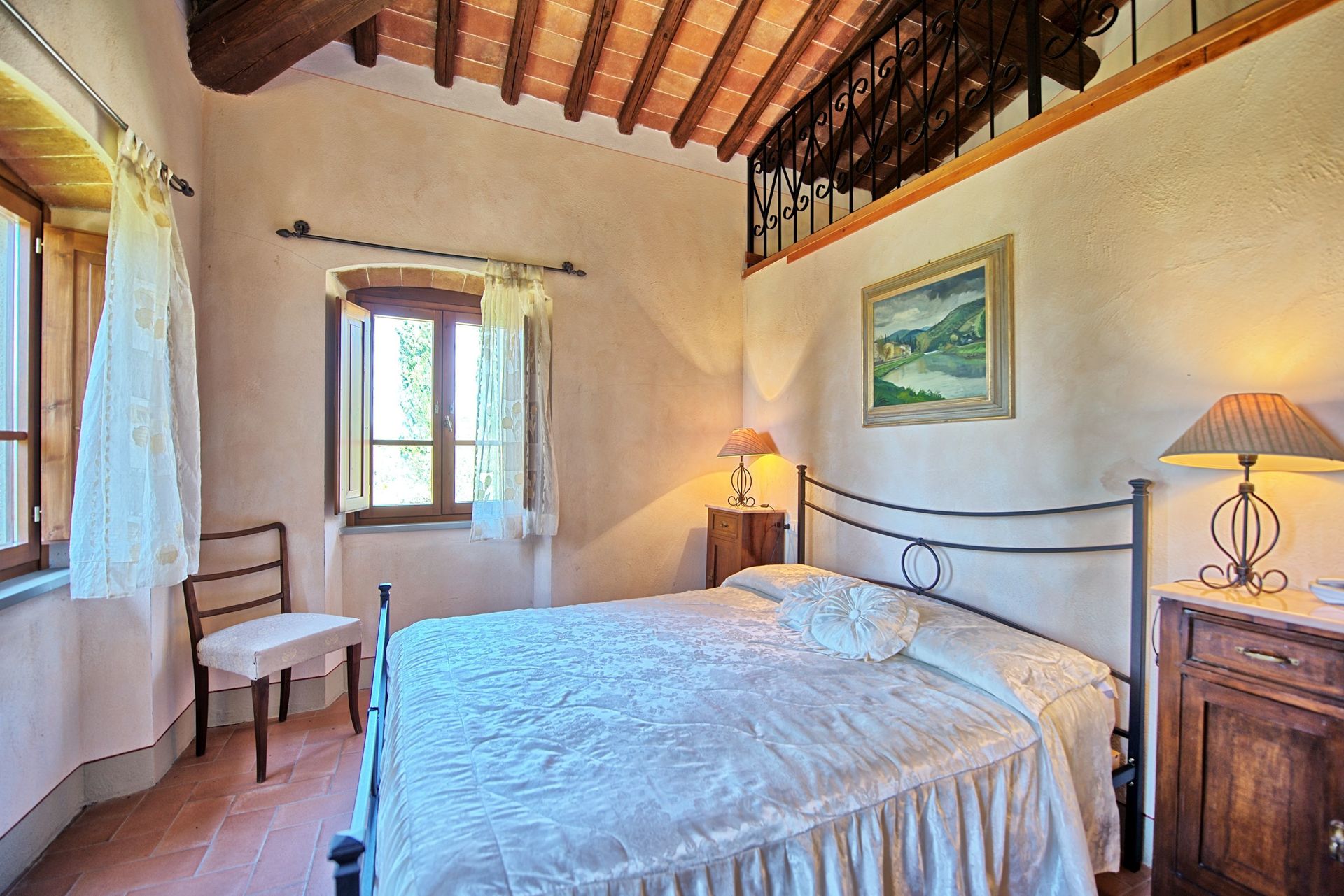 Anden sal (kun tilgængelig fra loggia På første sal via en vindeltrappe): åbent dobbeltværelse (uden dør) med eget badeværelse.