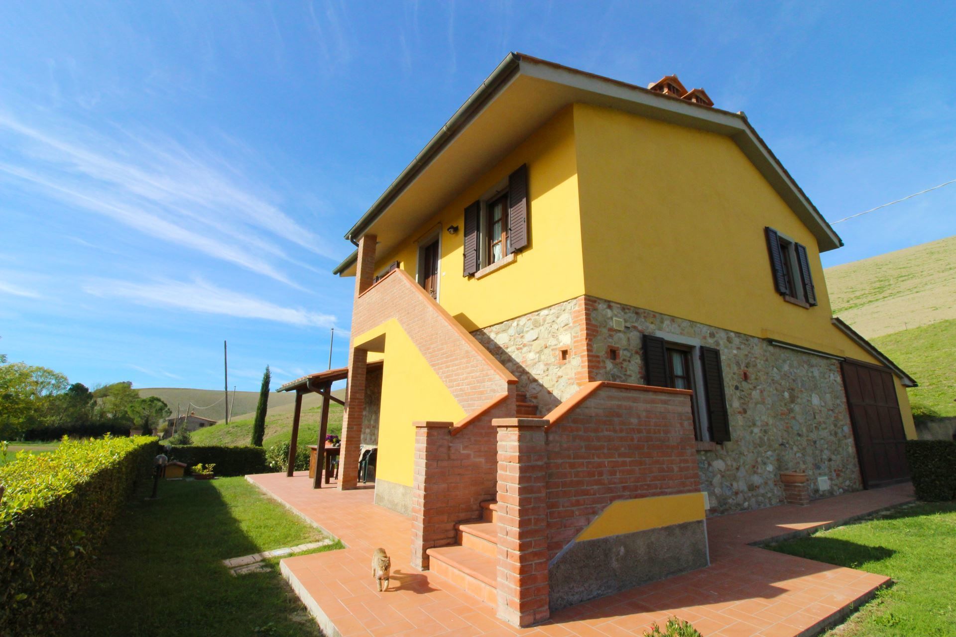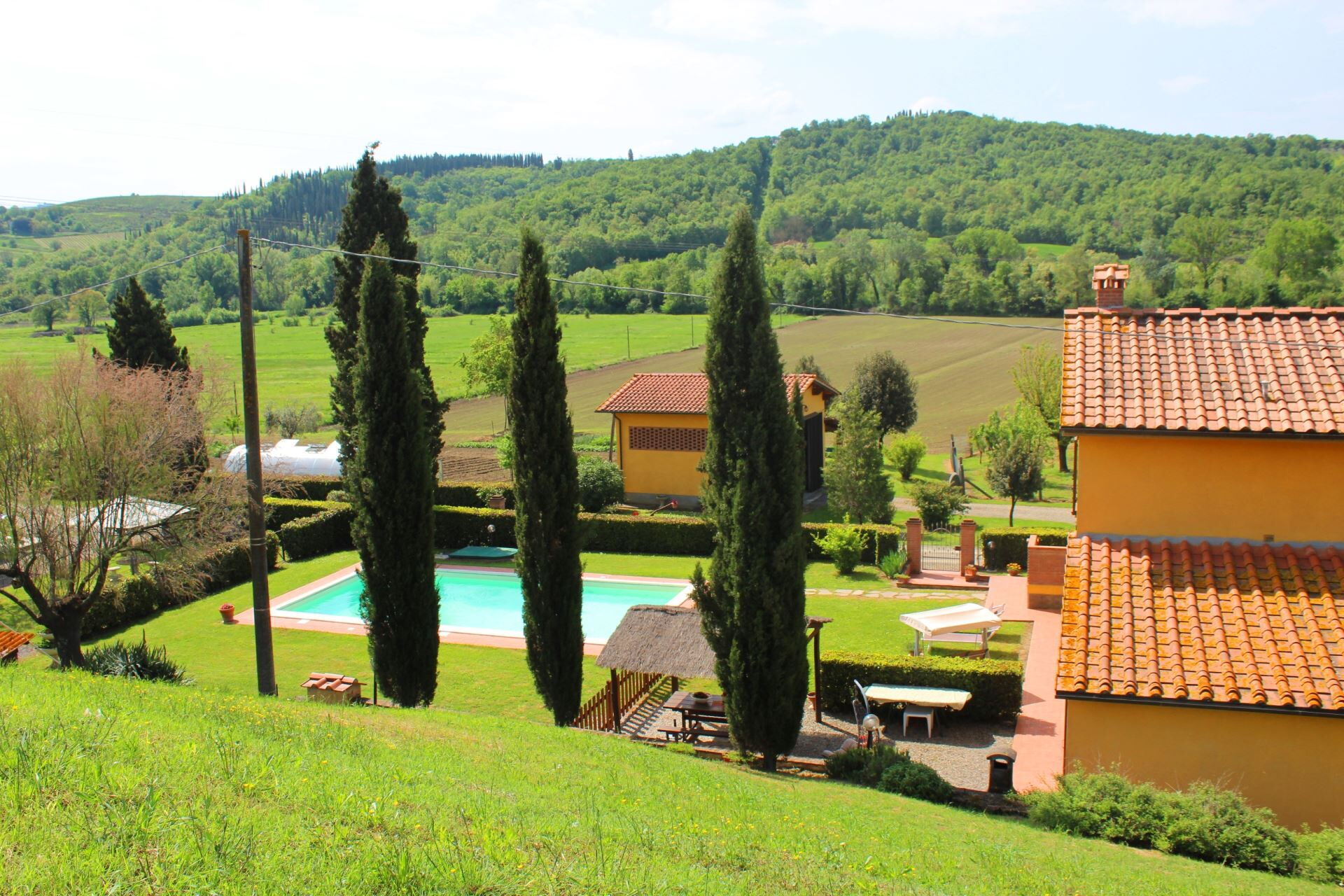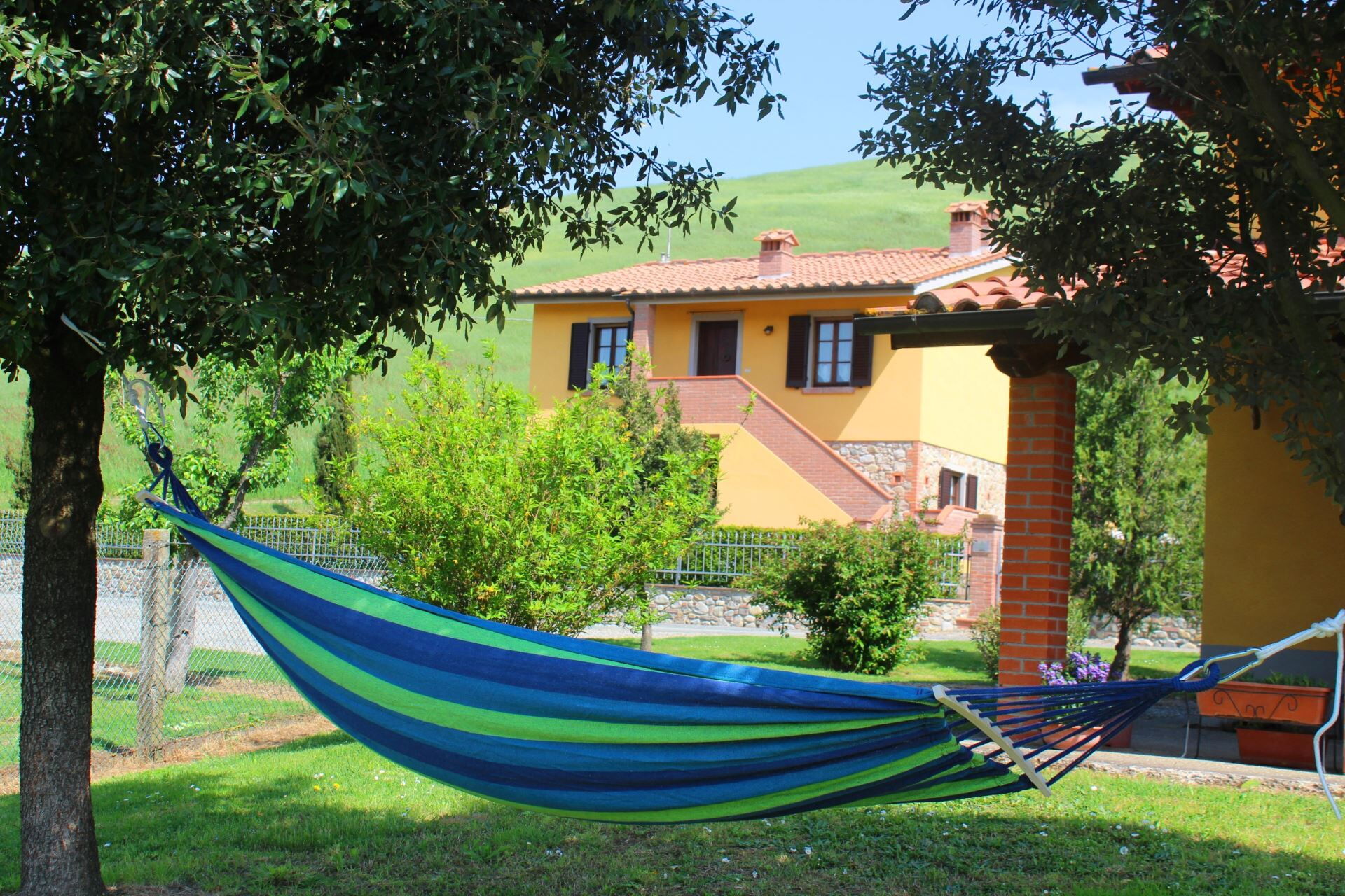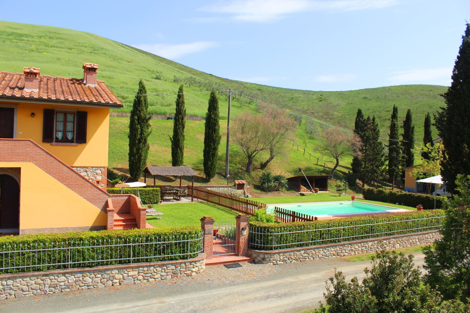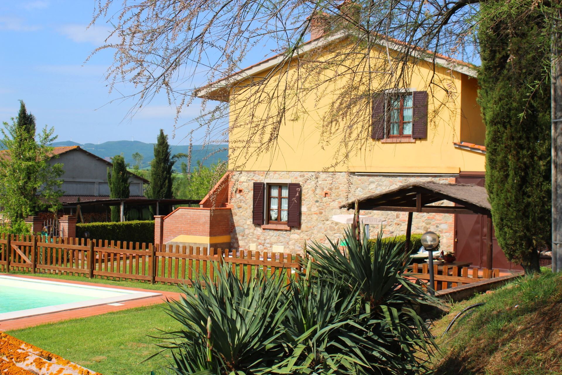 You will find the farmhouse in the tranquillity of the beautiful hills of the Alta Val di Cecina, with a beautiful view of endless, ever-changing natural landscapes. Soft green hills, expanses of golden cultivated fields and endless blue skies, all of which you can enjoy from the garden and your swimming pool. The perfect place, in our opinion, for an unforgettable holiday.