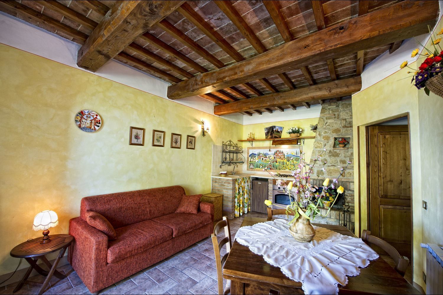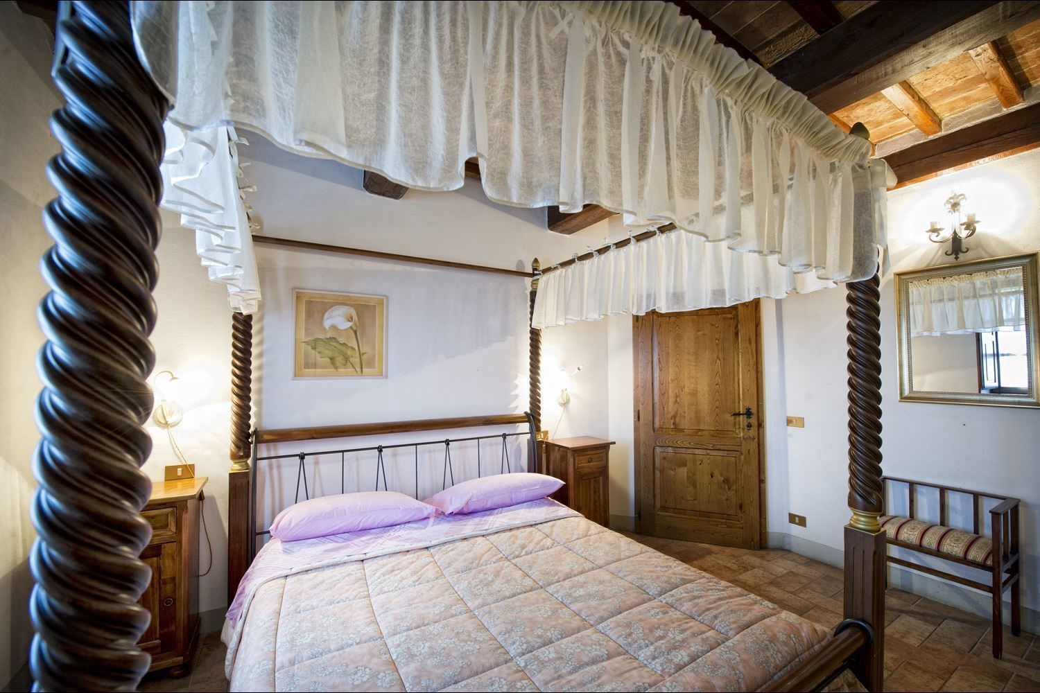 Ground floor apartment in the main house composed of living-dining room with kitchen corner, double sofa bed and fireplace, double bedroom with canopy bed, bathroom with shower.