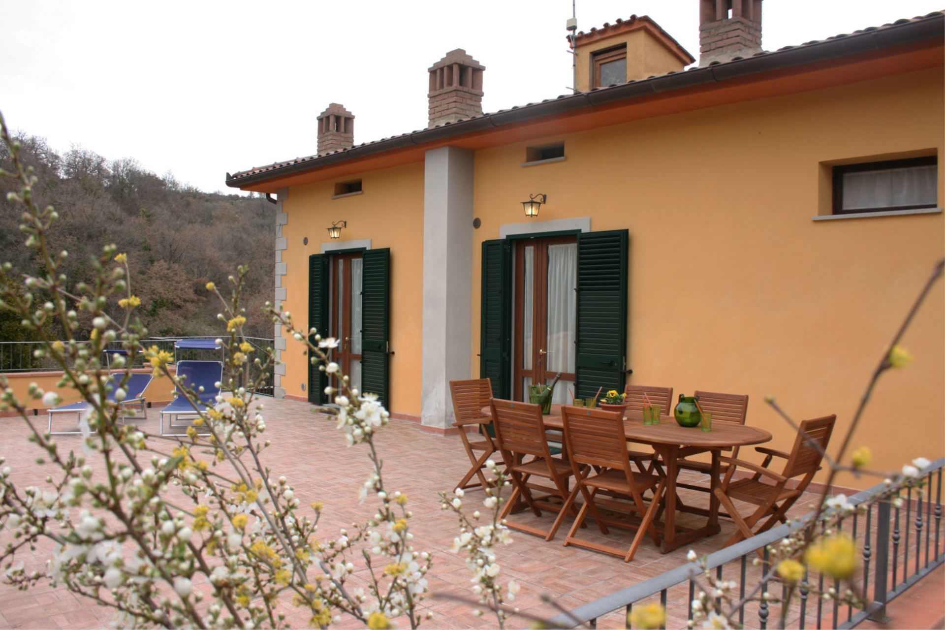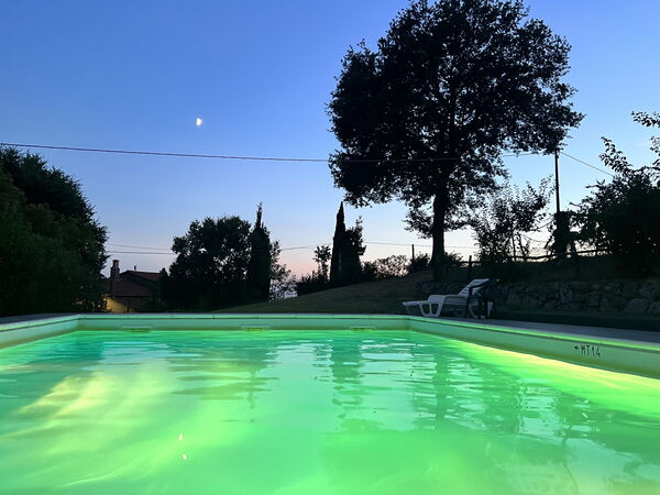 The renovated old farmhouse comprises on the ground floor some rooms occasionally used by the owners and the two guest apartments on the upper floor. An external stone staircase leads to a private sun terrace furnished with table and chairs for dining al fresco. From the terrace you will find both the access to the flats and, by climbing a few steps, to the beautiful swimming pool (size m. 10x5, depth m. 1-1,40 - open from 11 May to 28 September), private and equipped with sun beds and umbrellas. It is on the terrace that you will spend your days at the farmhouse. In the sun or under the umbrellas, in the cool of the morning or in the breeze of the summer evenings. For your dinners with your friends there is also a barbecue and an oven with a typical wood-burning stove. Parking is available within the property.