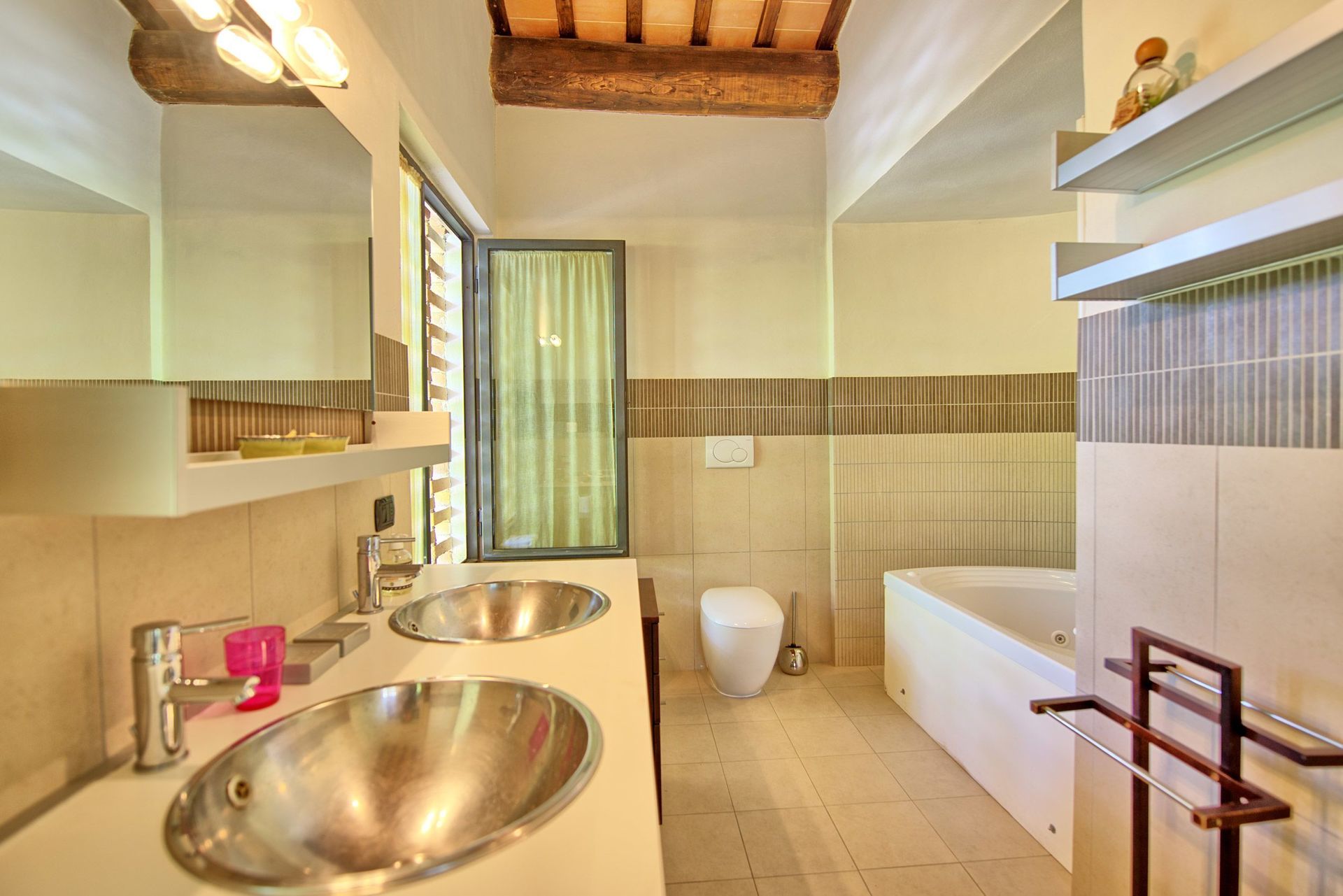Første sal : soveværelse med dobbeltseng (airconditioning; efter anmodning kan dobbeltsengen konverteres til 2 enkeltsenge), soveværelse med dobbeltseng (airconditioning) med eget badeværelse med jacuzzi, opholdsstue (airconditionering), badeværelse med bruser.