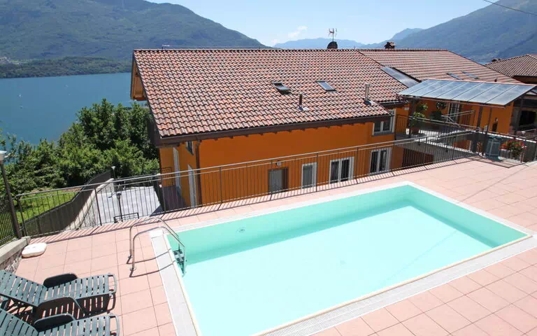 Residence "Azalee", 3 storeys. 10 apartments in the residence. 2 km from the centre of Domaso, in an elevated position on a slope, 2 km from the lake. For shared use: swimming pool (8 x 4 m, depth 140 cm, seasonal availability: 15.May.-30.Sep.). Outdoor shower, barbecue. In the house: hydro massage bath (extra). Washing machine (for shared use), heating available only from 15.10. to 15.04.. 50 m long steep motor access to the house. Roofed, parking on the premises. Grocery 1 km, restaurant 1 km, bar 1 km, shingle beach 2 km. Golf course 20 km. Please note: car recommended. The photograph shows a typical example. Free entry from june to september to the private beach with pool and bar "Lido di Gravedona", 5km from the residence. Clients can have a 15% discount at the restaurant pizzeria Mojito in Domaso.