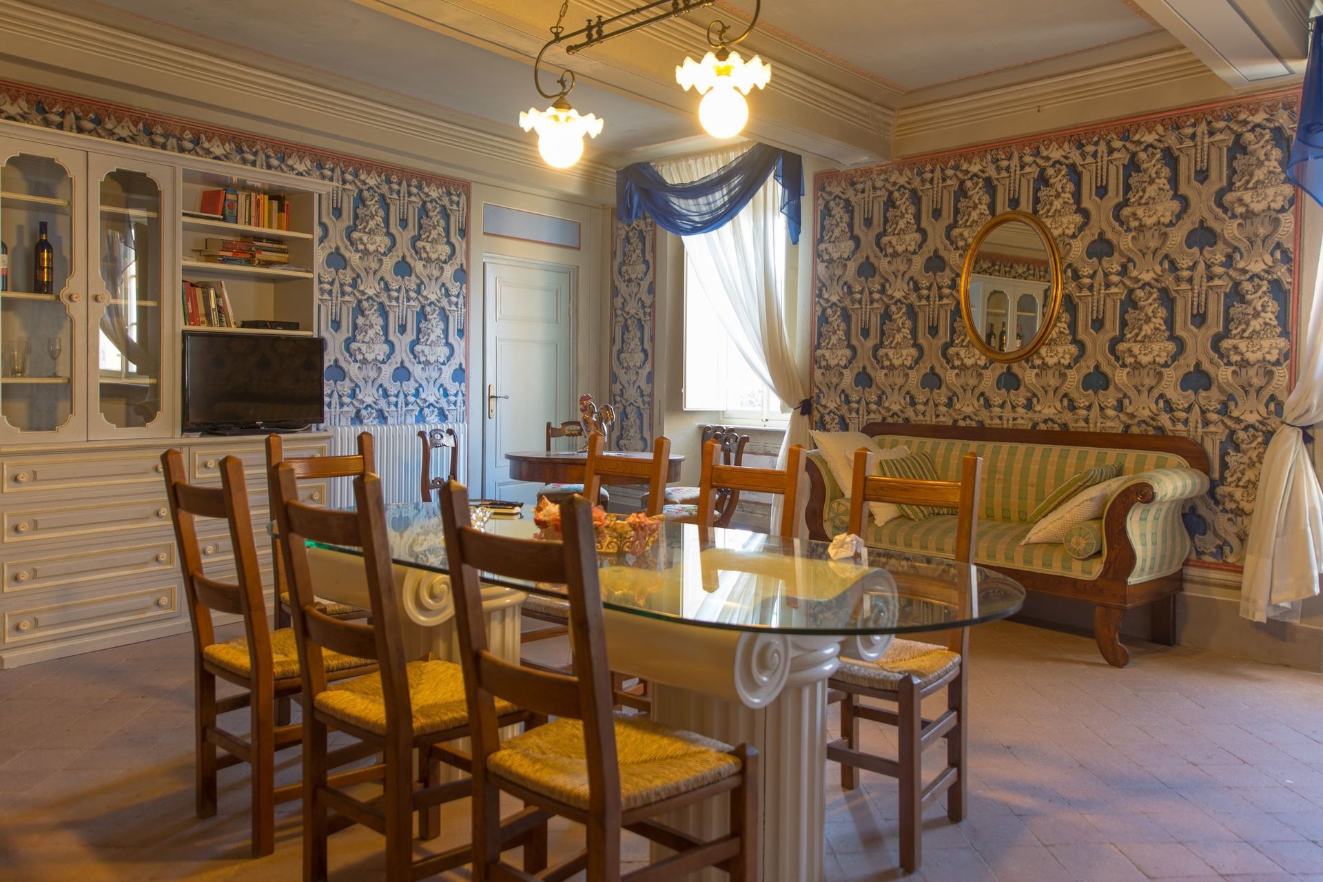 Første sal: Indgang til spiseplads med stue, køkken (ovn, opvaskemaskine, brødrister, kaffemaskine, fryser) med pejs, badeværelse med bruser, soveværelse med dobbeltseng, soveværelse med tre enkeltsenge, badeværelse med bruser (intet vindue), soveværelse med dobbeltseng.